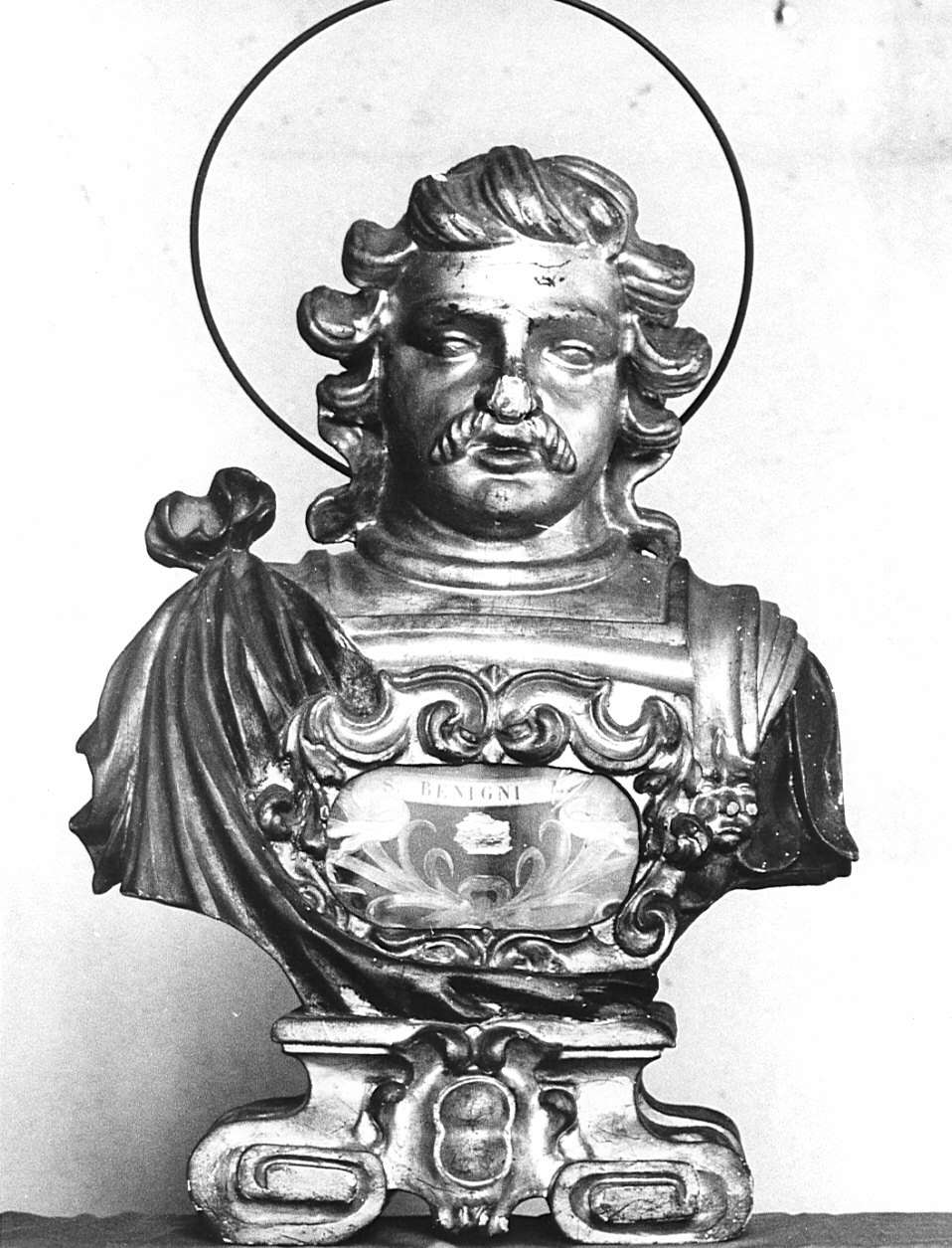 Busto reliquiario, per apparato d'altare, con base a volute e decorazioni geometriche su cui s'innesta il busto del Santo sul cui petto vi è la teca contenente la reliquia, circondata da volute e fogliame. Aureola in ferro battuto.