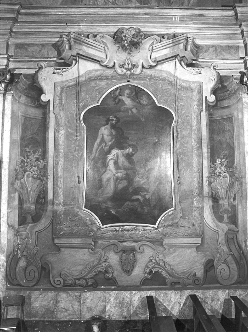 Quadratura a monocromo grigio; cimasa dell'ancona in stucco a forte rilievo. Il dipinto finge una parete ricurva davanti alla quale si innalza un'imponente ancona marmorea con ornati a volute e motivi fogliacei. Sui basamenti laterali a doppio modiglione poggiano due vasi color ocra con fiori variopinti; al centro della cimasa a trabezione ricurva un cartoccio e un bouquet di fiori variopinti. La pala centrale (scheda n. 0300098256) è inserita in un'ampia cornice mistilinea, che imita una superficie lignea dorata, intagliata a fitti motivi vegetali.