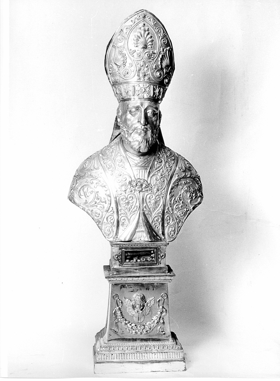 Busto di vescovo in lamina di metallo sbalzato argentato e dorato, recante sul capo una mitria. Il volto presenta barba e baffi. La decorazione a palmette e riccioli della mitria viene ripresa anche sul piviale. Il basamento trapezoidale ha nella parte inferiore un motivo a ovuli e scanalature, nella parte superiore è presente invece una ghirlanda sovrastata da un cherubino. Tra il busto e il basamento vi è un reliquiario.