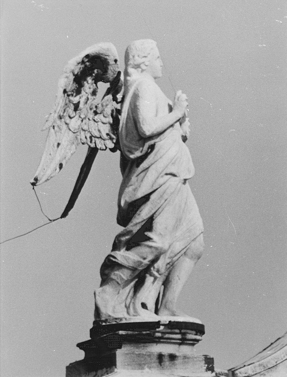 La statua rappresenta un giovane angelo che avanza tenendo tra le mani un cartiglio all'altezza del petto. La testa è sollevata verso destra, lo sguardo è alzato, il corpo è di tre quarti; la veste che lascia nuda le braccia si appoggia al corpo in ampie pieghe. Le ali sono di rame. L'ala destra e forata. La statua è posta su un piedestallo nella zona centrale del fastigio a sinistra della statua dell'Assunta.