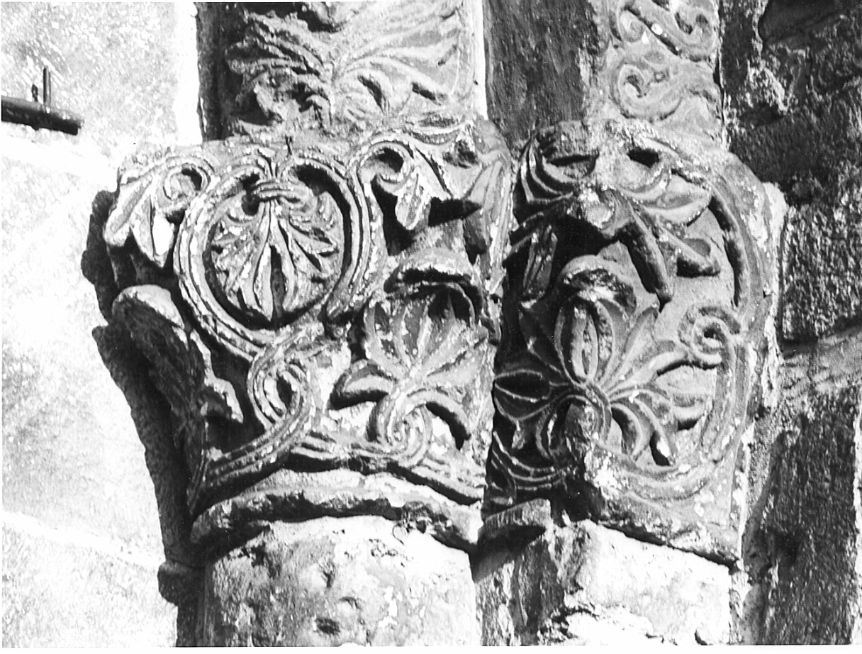Le due coppie di capitelli in pietra d'Angera situati all'imposa dell'arco che sorregge il portale esdterno sono decoati con motivi estremamente simili. Il capitellino angolare reca due coppie di fogliette polilobe, incrociantisi negli steli nastriformi a due nervature; i nastri racchiudono le due coppie di foglie in un motivo tondeggiante. Il capitello di semicolonna invece presenta una rota centrale campita da due fogliette polilobe annodate; dalla rota si dipartono due fogliette che simmetricamente marcano gli angoli superiori del capitello, mentre nella zona inferiore il nastro a tre nervature che dà forma alla rota si intreccia due volte e conclude in due coppie di foglie trilobe. Entrambi i capitelli presentano un collarino convesso.