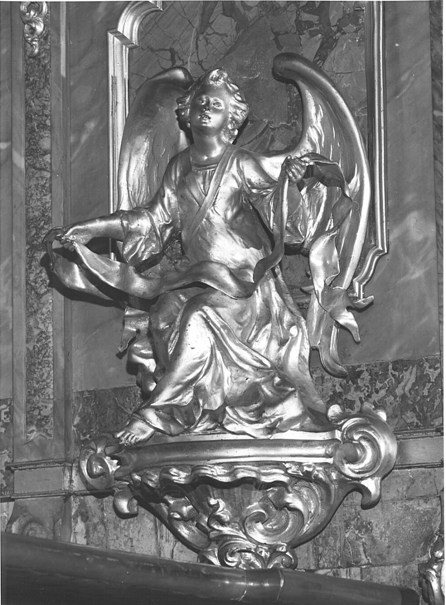 Sulla parete sinistra del tabernacolo si appoggia un angelo collocato su mensolina a voluta. E' seduto e tiene con le mani un cartiglio.