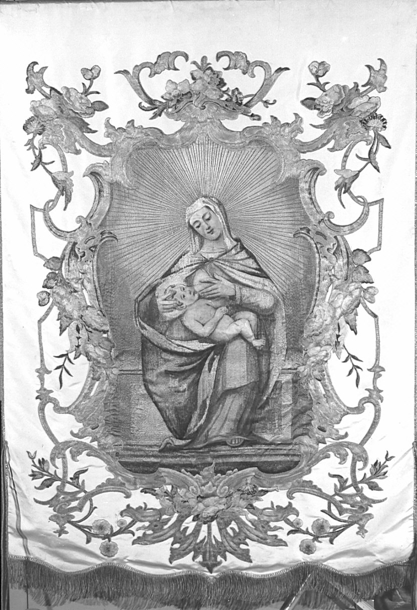 Stendardo rettangolare recante sul recto una decorazione a volute di vegetali e girali, contenente l'immagine figurata. Sull'orlo inferiore frangia a filo d'oro.. Personaggi: Madonna; Cristo Bambino