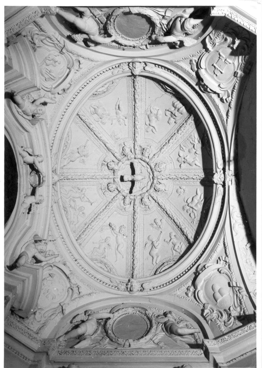 Cupola ripartita in otto spicchi ornati da angeli con strumenti musicali e ghirlande e da cherubini. Tondo centrale con colomba. Nei pennacchi, stemma della famiglia Poggi scomposto nei suoi elementi araldici (unicorno, tre monti, torre).. Figure: angeli; cherubini. Simboli: colomba