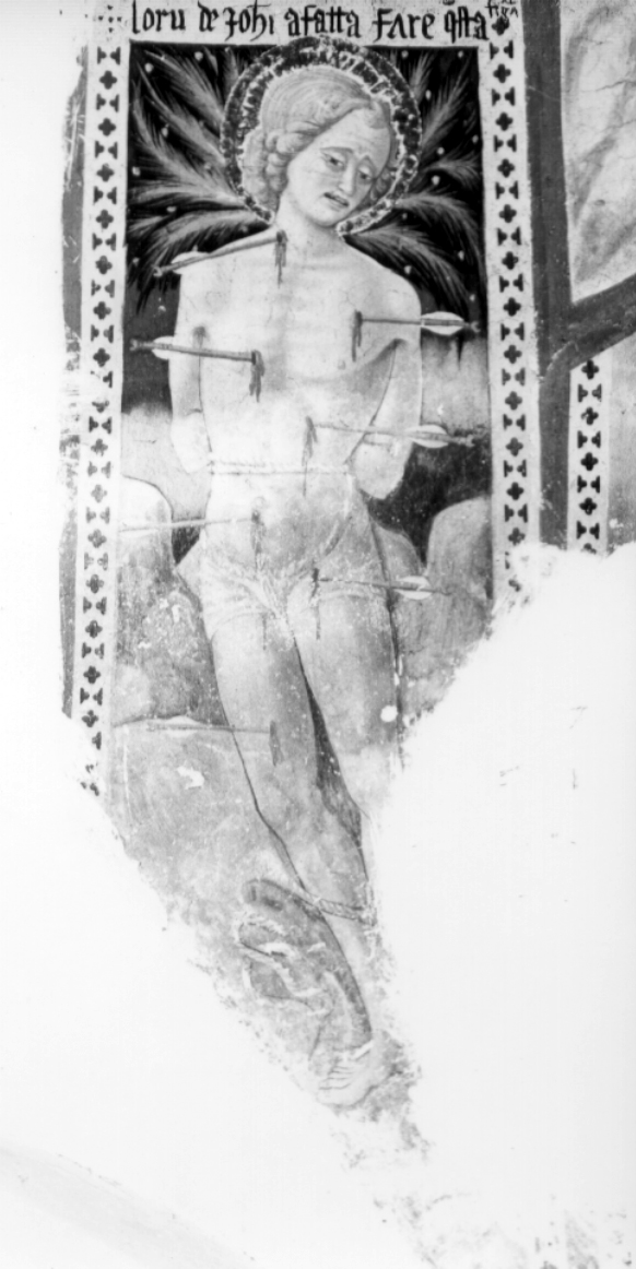 Personaggi: San Sebastiano. Attributi: (San Sebastiano) frecce; palma del martirio. Paesaggi: rocce