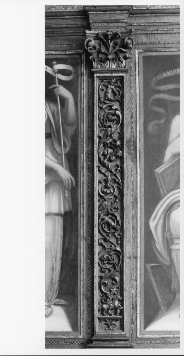 Parasta con capitello composito intagliato con motivi vegetali e serpenti.. Decorazioni: motivi a voluta. Animali: cavallo; aquila. Figure: cavaliere