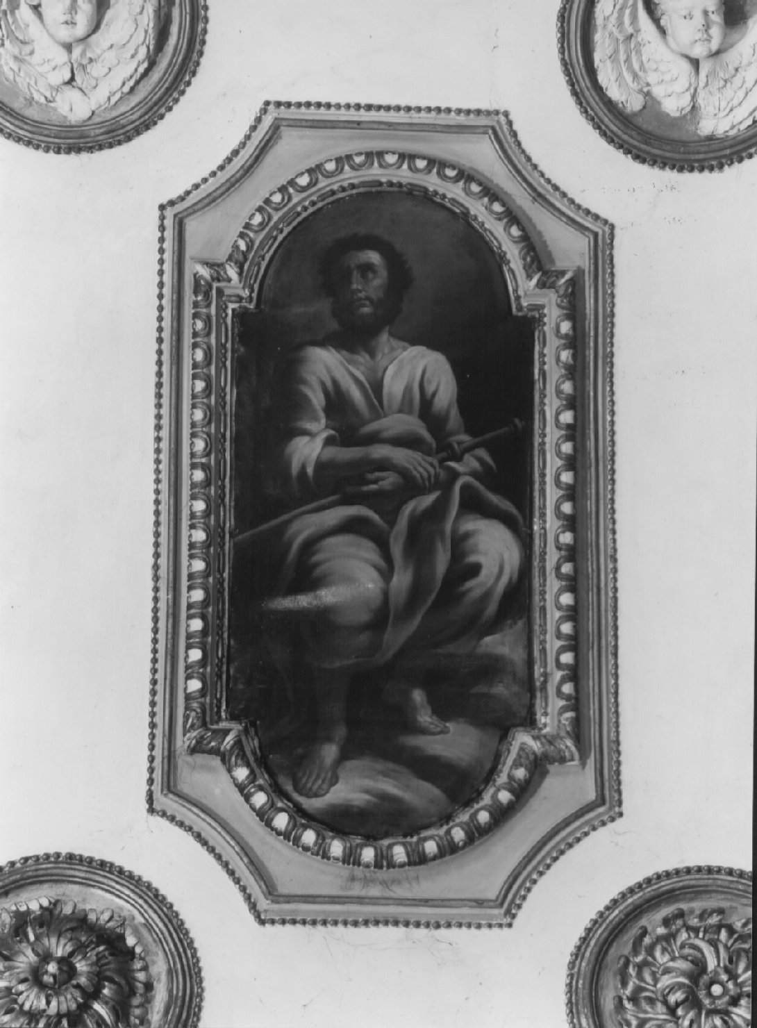 Dipinto inquadrato da ricca cornice mistilinea in stucco dorato, decorata con foglie d'acanto, ovuli e fuseruole.. Personaggi: San Giacomo. Attributi: (San Giacomo) bastone da pellegrino