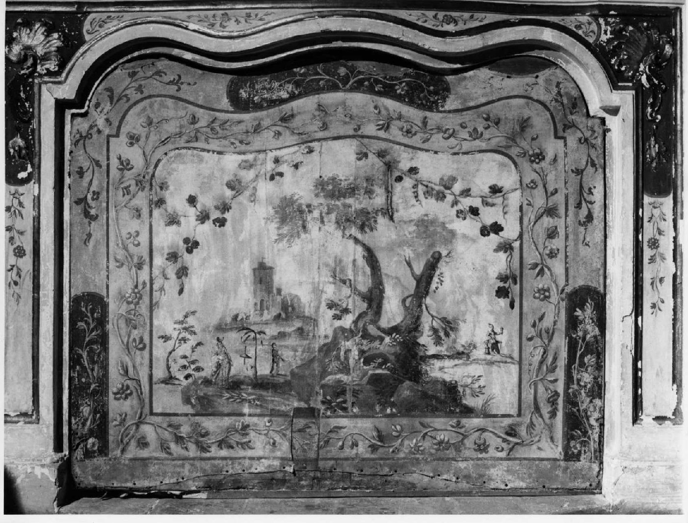 Parafuoco dipinto a motivi vegetali e un paesaggio.