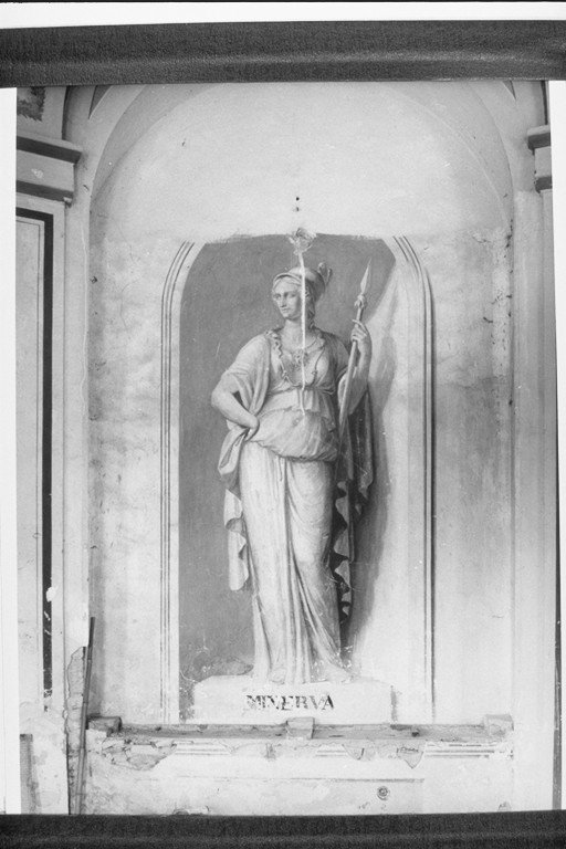 Nicchia centinata incorniciata nell'estradosso da fascia policroma e defin ita nella profondità da chiaroscuro illusionistico all'interno, finta stat ua a monocromo raffigurante Minerva come figura astante abbigliata con lun ga tunica drappeggiata sotto il seno e ai fianchi, e chiusa sul petto da f ermaglio a testa di Gorgone; ricco mantello ricadente lungo i fianchi ha i l volto girato di tre quarti verso sinistra e porta il caratteristico elmo con civetta nel cimiero, da cui fuoriescono lunghe ciocche in boccoli sul le spalle sostiene con la sinistra sollevata una lancia, mentre tiene il b raccio destra ripiegato e appoggiato sul fianco in basso, nella nicchia, b asamento con iscrizione didascalica.