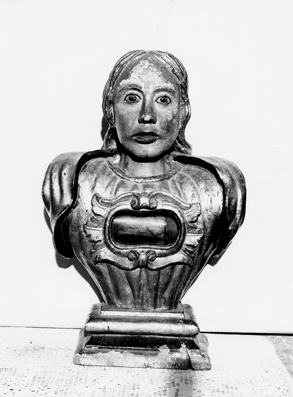 Il Santo raffigurato è con i capelli lunghi e spalle coperte da manto. al centro del busto è la teca con cornice a volute.