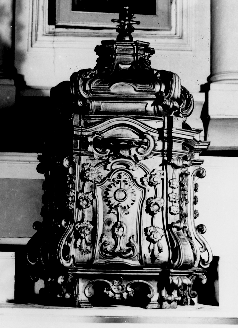 La struttura è decorata con volute, festoni floreali e cornici mistilinee. A frante dello sportello reca l'immagine del S.mo Sacramento e sulla copertura la croce.