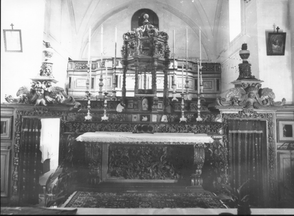 Mensa sostenuta da volute vegetali con paliotto decorato a traforo. Il dossale è costituito da una monumentale struttura riccamente scolpita emergente con un tabernacolo centrale e candelieri laterali.