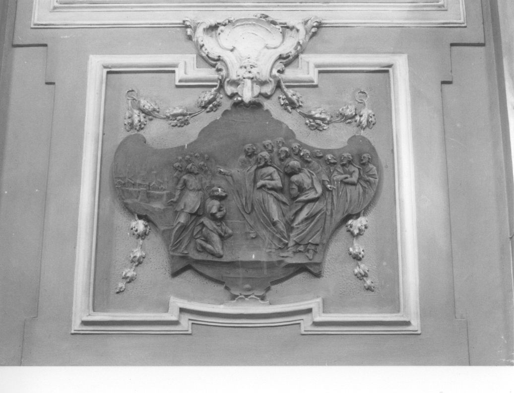 Formella a rilievo con forma sagomata.. Personaggi: Cristo; Apostoli. Figure: lebbrosi
