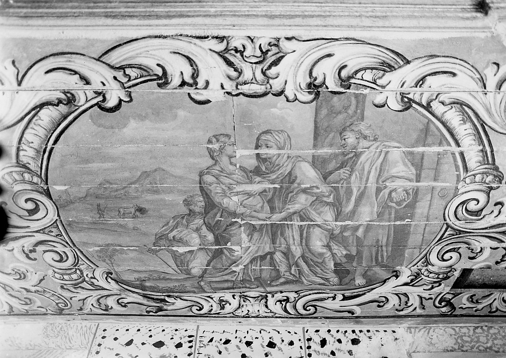 L'incontro della Madonna e S. Elisabetta avviene con un abraccio, all'aperto con S. Giuseppe e Zaccaria dinanzi alle loro case.