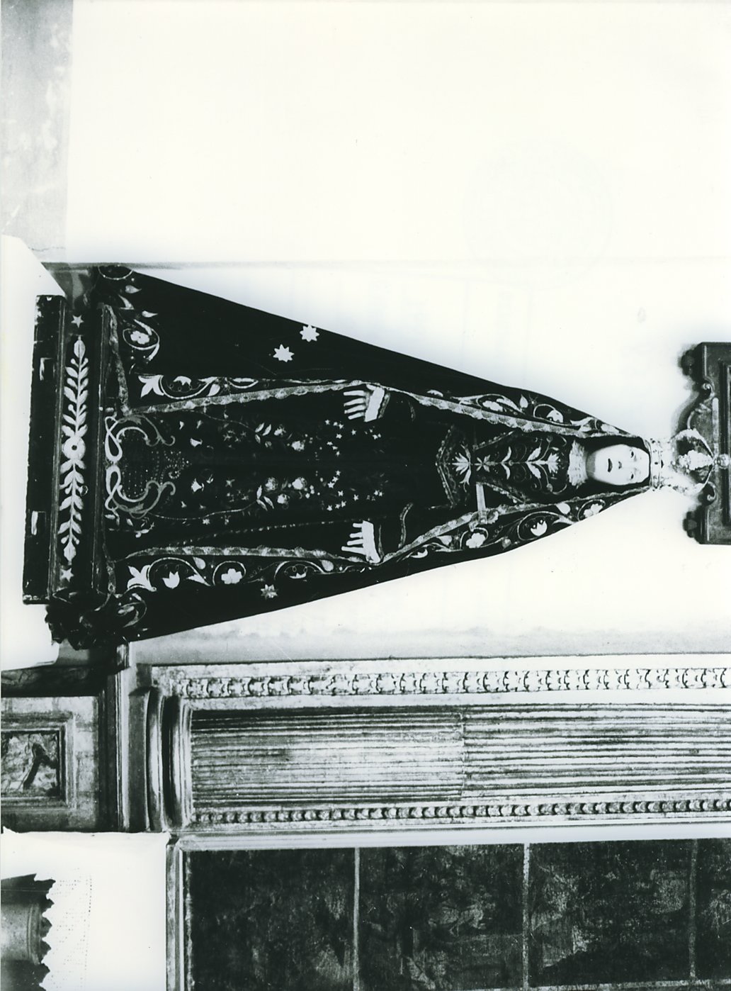 La veste e il mantello presentano ricche decorazioni dorate e ricami. La statua è una conocchia.