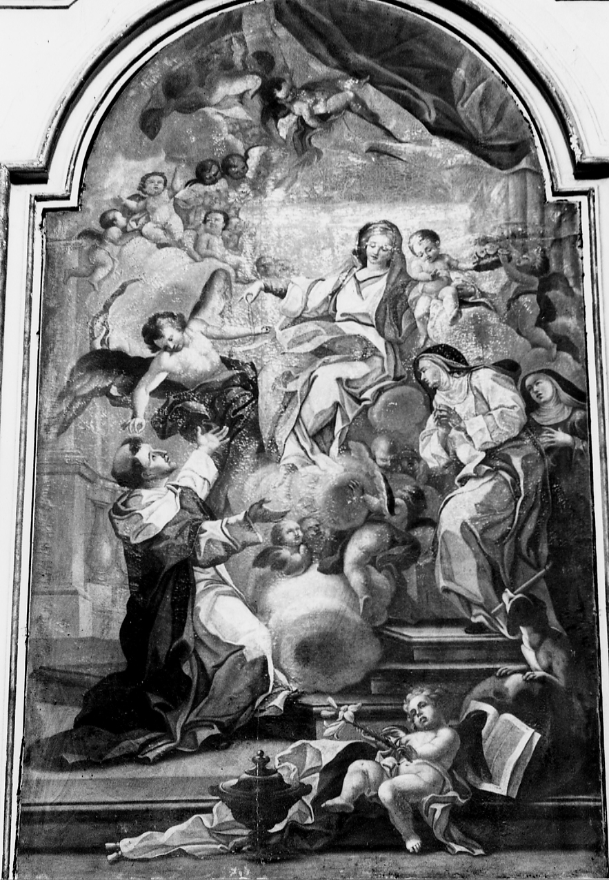 LA MADONNA, VESTITA DI TUNICA BIANCA E MANTO AZZURRO, E' RAPPRESENTATA SEDUTA SU NUVOLE, TRA UNA GLORIA DI ANGELI E CHERUBINI. AI SUOI PIEDI SONOS. DOMENICO E SANTA CATERINA DA SIENA IN PREGHIERA. IN PRIMO PIANO, A DESTRA, E' UN ANGIOLETTO ADAGIATO TRA OGGETTI SIMBOLICI.