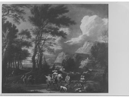 Soggetti profani: soggetti di genere. Paesaggi: bosco. Architetture: edif icio. Figure: cacciatori; gentildonna; servi. Animali: cavalli; cani; cerv o. Oggetti: bastoni; fiasche; fucili. Vegetali: alberi. Fenomeni naturali: nuvole