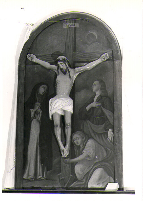 Dipinto centinato su cui è applicato un Crocifisso ligneo (cfr. scheda n. 00034817). Al centro campeggia la croce; a sinistra della croce vi è l'Addolorata, in tunica rossa e manto blu, e a destra San Giovanni Evangelista, in tunica verde e manto rosso. Ai piedi della croce vi è la Maddalena con i capelli sciolti in tunica verde chiaro e manto color malva.. Personaggi: Madonna Addolorata; San Giovanni Evangelista; Santa Maria Maddalena. Abbigliamento: tunica; manto. Corpi celesti: sole; luna. Oggetti: croce