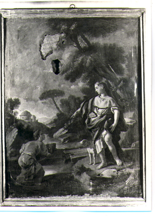 paesaggio attraversato da un fiume; a sinistra l'Arcangelo e a destra Tobia con un pesce. Personaggi: Tobia; San Raffaele Arcangelo. Abbigliamento. Paesaggi. Fiumi: Tigri. Animali: cane. Attributi: (Tobia) pesce. Architetture