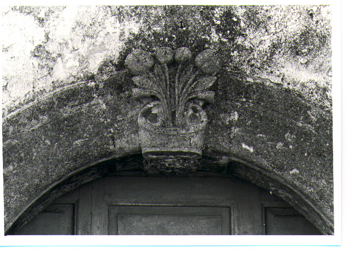 Il rilievo, concio di volta di un portale ad archivolto, raffigura un vaso dalla prospettiva alquanto deformata contenente quattro tulipani.