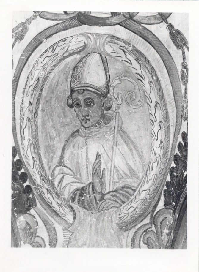Il santo è rappresentato con aspetto severo. Indossa una mitra vescovile, di cui è ancora leggibile parte della ricca decorazione; regge, inoltre, un pastorale a riccio, tipicamente latino, col braccio sinistro, mentre benedice con la mano destra.. Personaggi: santo vescovo. Abbigliamento: mitra e pastorale