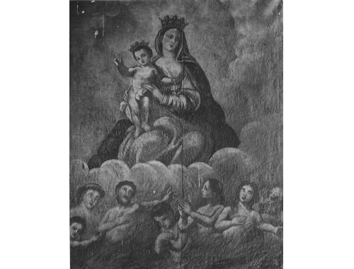 Al centro del dipinto la Vergine, incoronata ed emergente dalle nubi,regge con entrambe le mani il Bambino nudo, incoronato e benedicente. Inbasso, anime purganti di uomini, donne, bambini, in atteggiamento dipreghiera o invocazione.