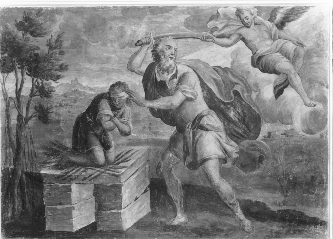 Personaggi: Abramo; Isacco. Figure: angelo. Oggetti: pira; spada. Paesaggi. Piante: albero. Fenomeni metereologici: nuvole