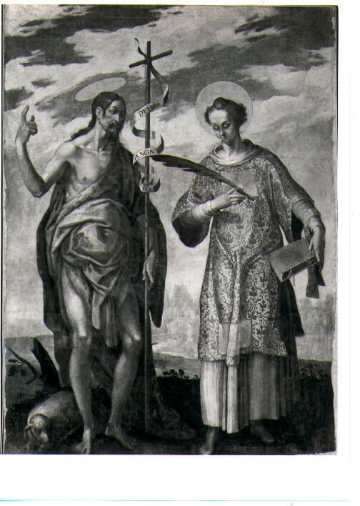 Dipinto ad olio su tela senza cornice; raffigura i SS. Giovanni Battista e Stefano: San Giovanni sulla destra, avvolto in un manto rosso che gli lascia scoperte spalle e gambe, regge un'esile croce e indica con la mano destra il cielo; ai suoi piedi è accucciato un agnello, S. Stefano in veste da diacono sulla sinistra regge un libro e la palma del martirio. Lo sfondo è occupato da un basso paesaggio che sfuma gradatamente in lontananza.. Personaggi: San Giovanni Battista; Santo Stefano. Abbigliamento: (San Giovanni Battista) manto; (Santo Stefano) veste da diacono. Attributi: (San Giovanni Battista) croce; agnello; (Santo Stefano) libro; palma del martirio. Paesaggi