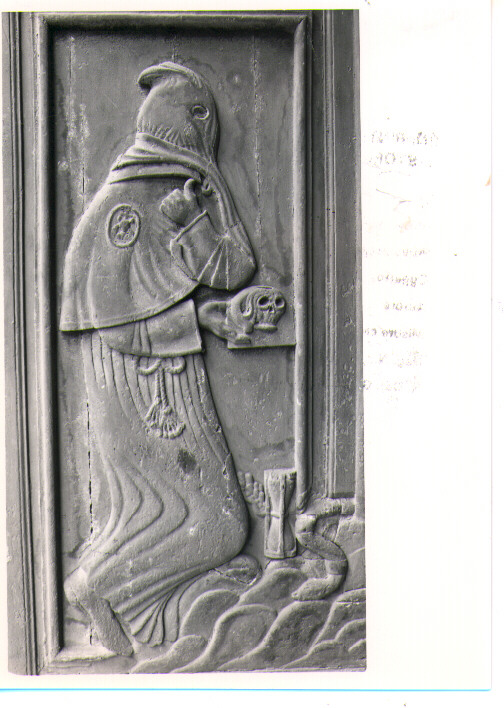 la figura è inginocchiata, col capo coperto da un cappuccio e con in mano un piatto su cui è posto un teschio umano; in basso, una clessidra e la testa di un serpente. Figure: confratello della Buona Morte. Abbigliamento religioso: manto; cingolo; cappuccio. Attributi: (Confratello) teschio umano. Oggetti: clessidra. Animali: serpente