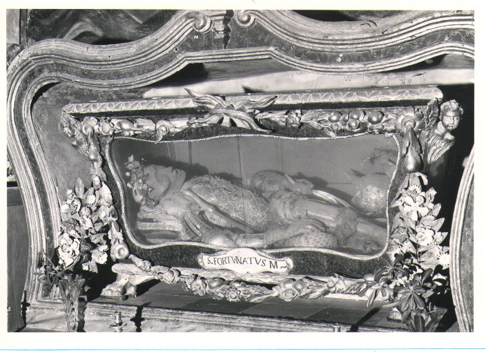 Reliquiario a cassone poggiante su piedi ferini, circondato da un'abbondante festone di fiori e frutta; in sommità è fiancheggiato da testine di cherubini e sormontato da una greca a palmette.