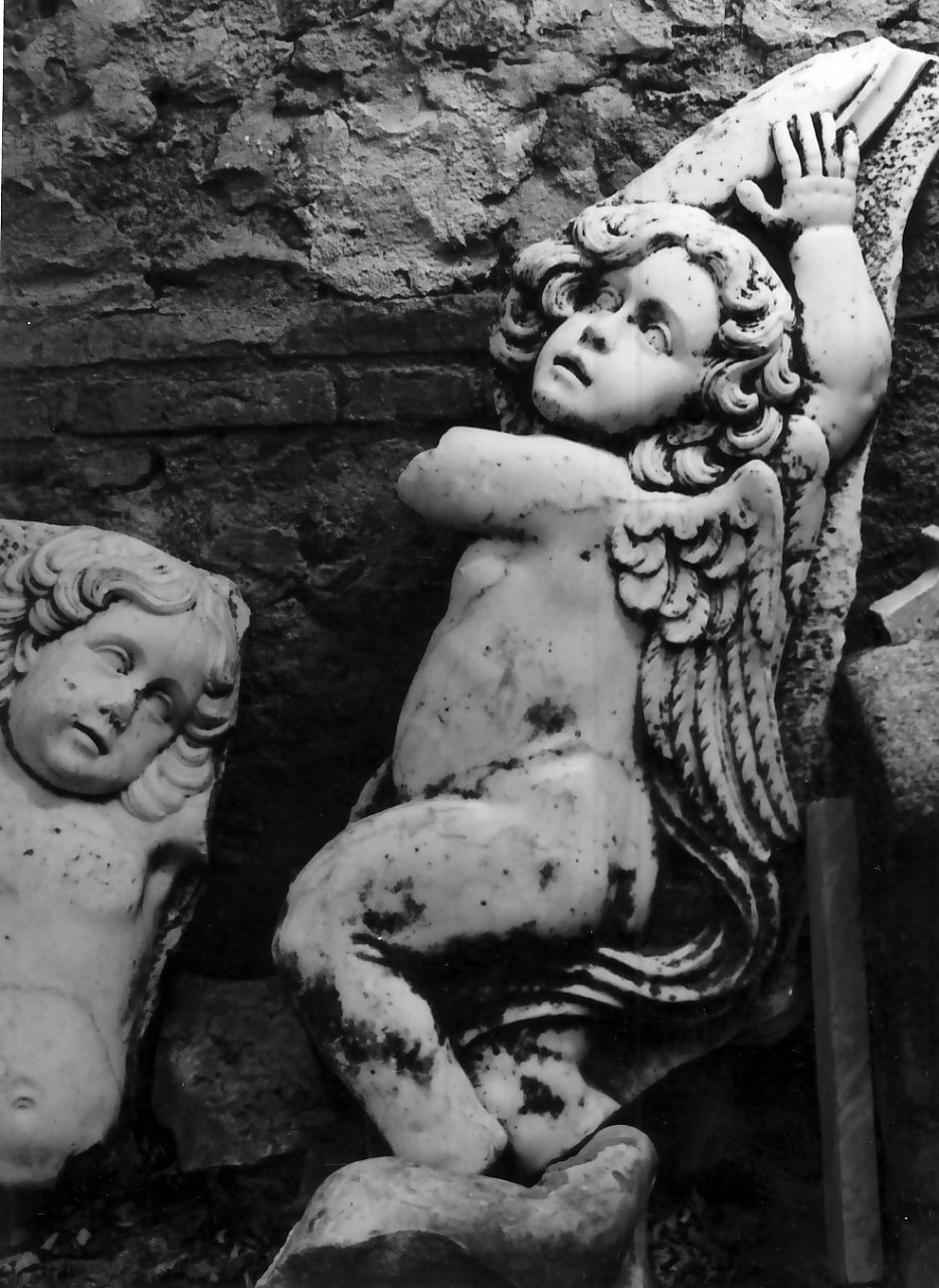 L'angelo è rfaffigurato con il corpo di profilo e dil viso di tre quarti. Il braccio destro è sollevato a reggere il resto di un originario tondo. Visibili ancora le ali ed un drappo che parte dalla schiena e si ferma nel vuoto creato dalle gambe semiaperte. Interessanti i tratti anatomici del vispo angioletto orante.. Figure: angelo