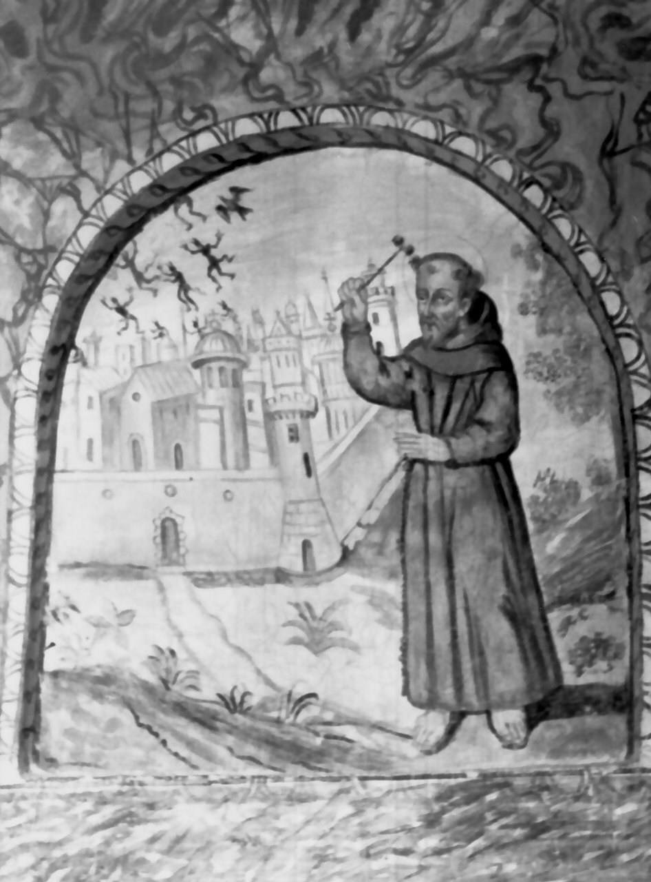 Dipinto murale raffigurante San Francesco d'Assisi scaccia i diavoli da Arezzo.. Personaggi: S. Francesco d'Assisi. Attributi: (S. Francesco d'Assisi) saio francescano. Figure: diavoli. Vedute: Arezzo