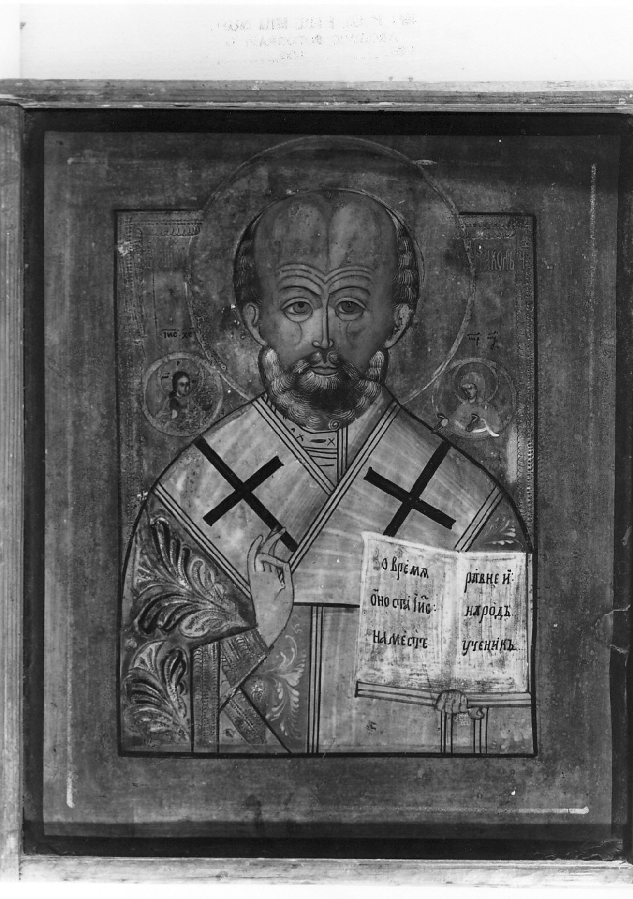 Icona raffigurante S.Nicola di Bari, con ai lati, entro tondi, Gesù Cristo e la Madonna.. Personaggi: S. Nicola di Bari. Attributi: (S. Nicola di Bari) libro