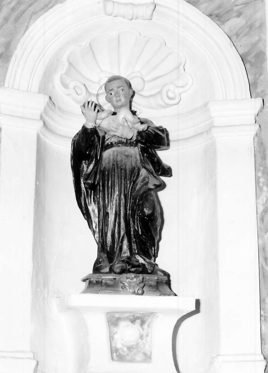 Statua raffigurante Santo gesuita con bambinello in braccio.. Personaggi: Santo gesuita; bambino Gesù. Attributi: (Santo gesuita) abito dell'ordine