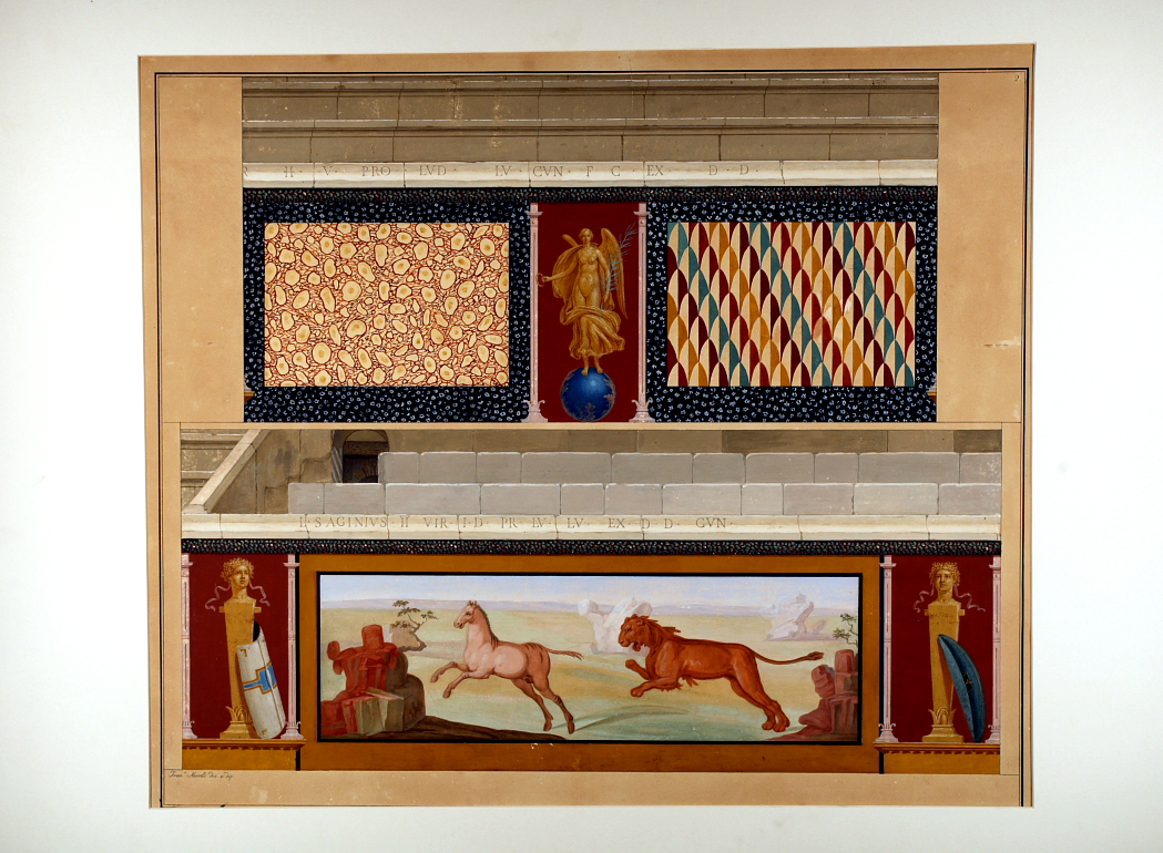 Il disegno raffigura un podio decorato con un fregio composto da un pannello rettangolare raffigurante una scena di caccia tra un leone ed un cavallo inseriti in un paesaggio roccioso; ai lati del pannello, inquadrate da esili colonne, sono visibili erme maschili con scudi. Al di sopra regio è visibile una cornice marmorea bianca su cui si legge l'iscrizione:" L SAGINVS II VIR I D PR LV LV EX D D CVN". Segue la raffigurazione dei gradoni della cavea dell'anfiteatro sormontata dal secondo fregio dipinto costituito da un pannello ad imitazione marmorea (numidico) e da un pannello con motivo a squame bipartite, intercalati da uno stretto scomparto con Vittoria alata su globo, inquadrata da esili colonne. Il fregio si chiude con una cornice marmorea bianca con l'iscrizione:"H LVD LV CVN F C EX D D".. Decorazioni: podio; fregio; scena di caccia; colonnine; erme; scudi; cornice; iscrizione; pannello a squame; Nike
