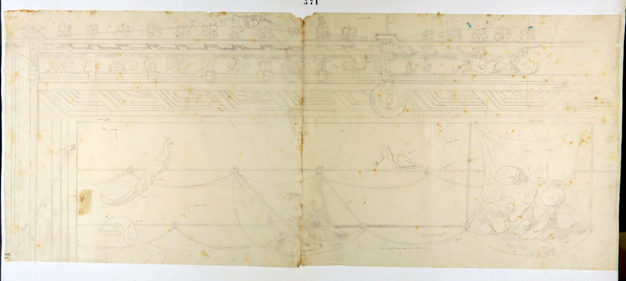 Il disegno raffigura la parte superiore di un'edicola con soffitto a cassettoni, sotto la quale è sospeso un drappo, nelle cui pieghe è adagiata della frutta; sulle corde che tengono il drappo sono appollaiati degli uccelli.. Elementi architettonici: edicola. Oggetti: drappo; frutta. Animali: volatili