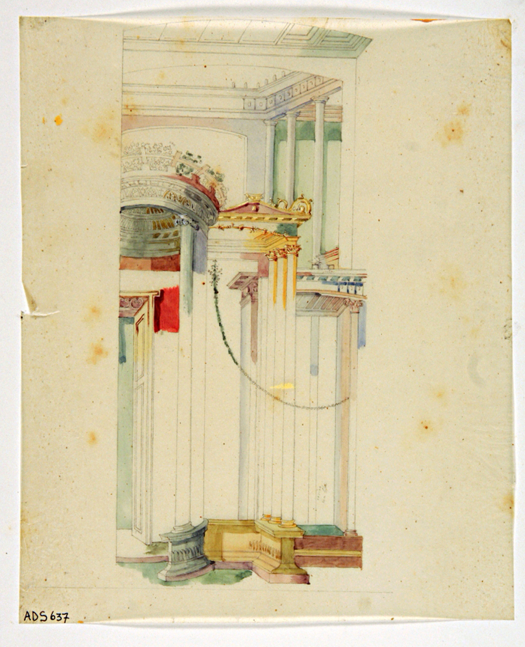 Il disegno, parzialmente acquarellato, presenta una "thòlos", riprodotta per tre quarti, con pergola sovrastante, sotto cui si apre una porta, raffigurata per metà, con un battente aperto; a destra si trovano due edicole sorrette da colonne, su cui poggia un portico con colonnato; un festone è sospeso dinnanzi alle due edicole. Il giallo è usato per lo zoccolo ed il tetto di un'edicola, il rosso per la parete accanto alla porta della thòlos.. Architetture fantastiche: thòlos; edicole; portico; ghirlanda