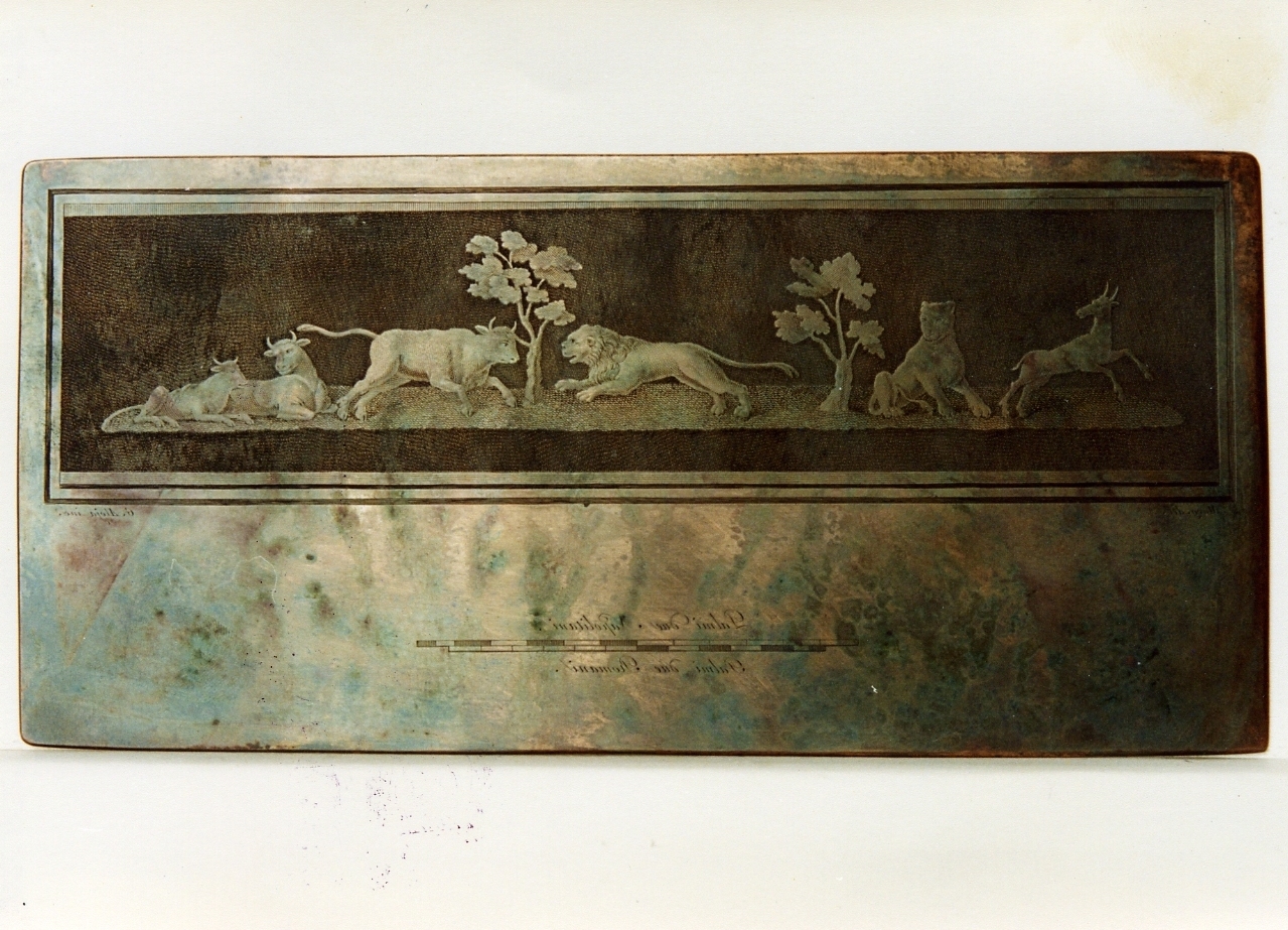 scena di caccia tra leoni, tori e capra/ Madonna in gloria tra angeli. (matrice d'incisione recto-verso)
