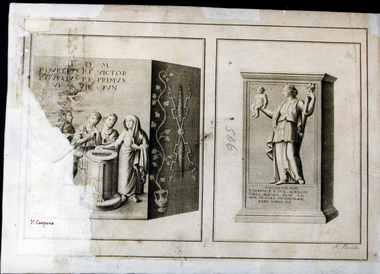 stele con scena di sacrificio ed iscrizione latina/ stele con Giunone ed iscrizione latina. (stampa controfondata)