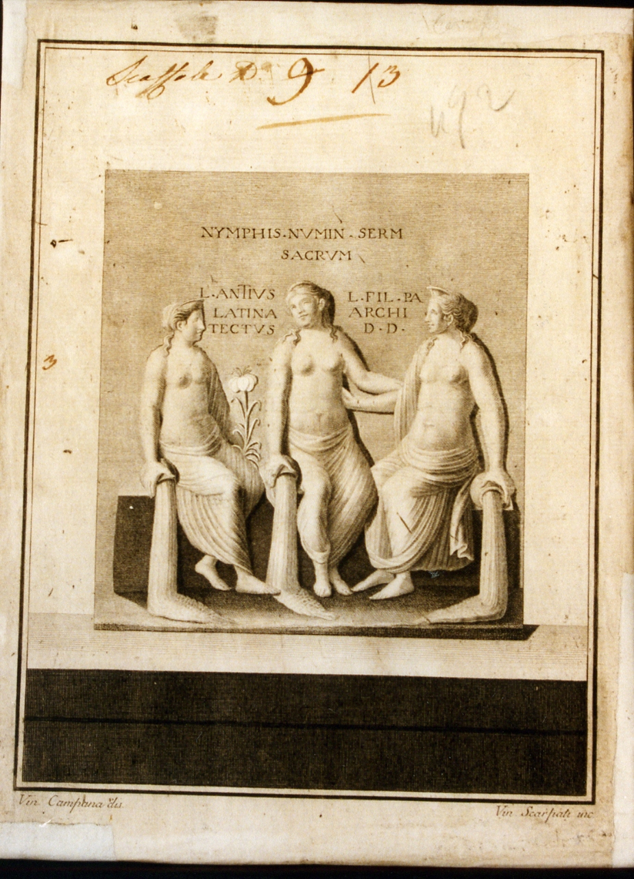 rilievo con raffigurazione di ninfe che reggono una brocca da cui sgorgaacqua ed iscrizione latina (stampa controfondata)
