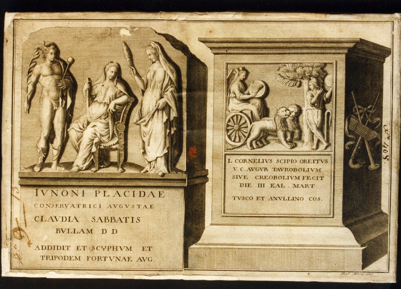 Alloja Giuseppe; Alloja Giuseppe, ara con raffigurazione di una biga su cui siede Iside Fortuna trainata daleoni e iscrizione latina/ stele con raffigurazione di Giunone, Mercurio euna vestale e iscrizione latina dedicatoria (matrice)