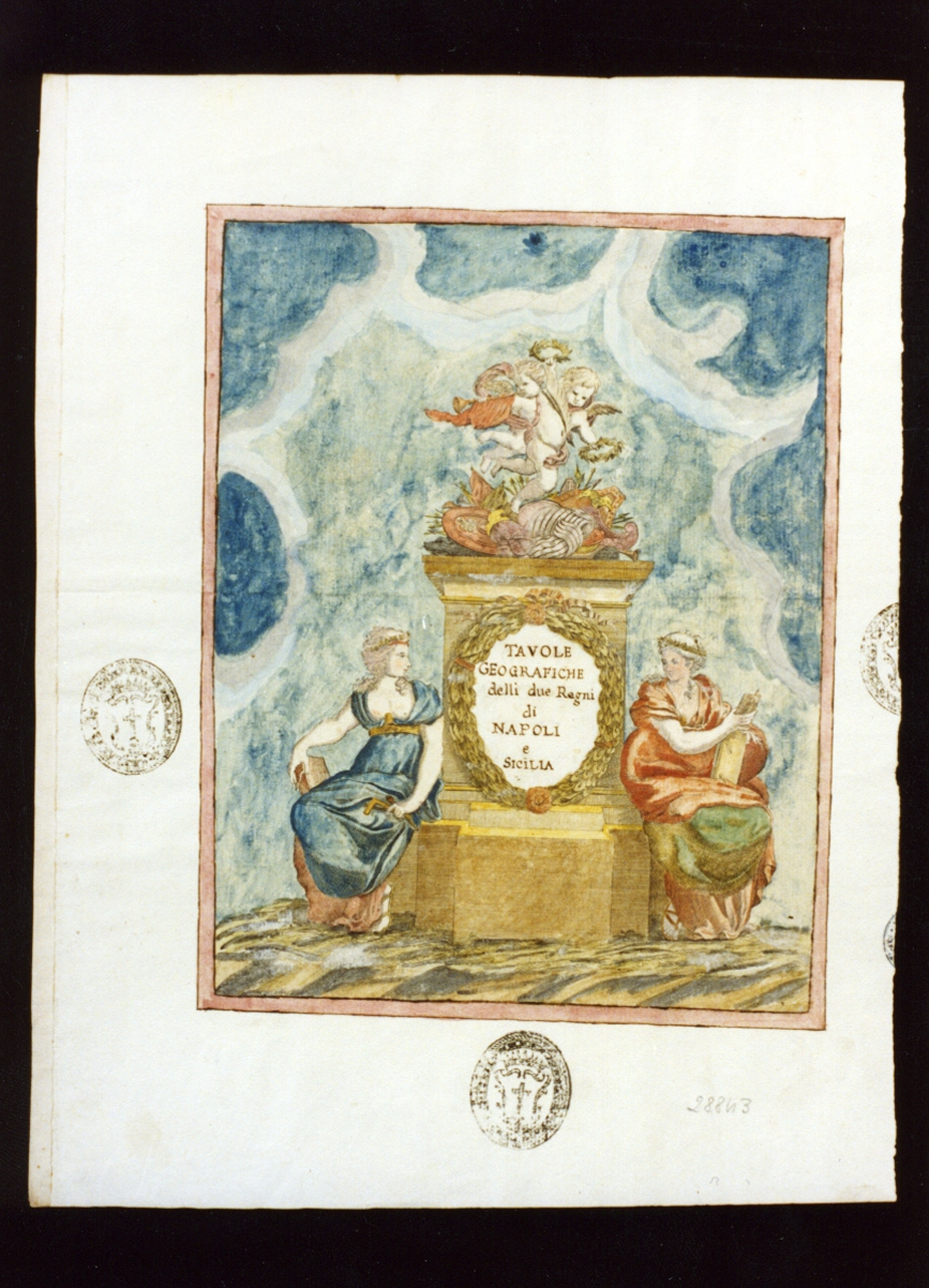 figure allegoriche femminili con putti alati con attributi militari (stampa a colori)