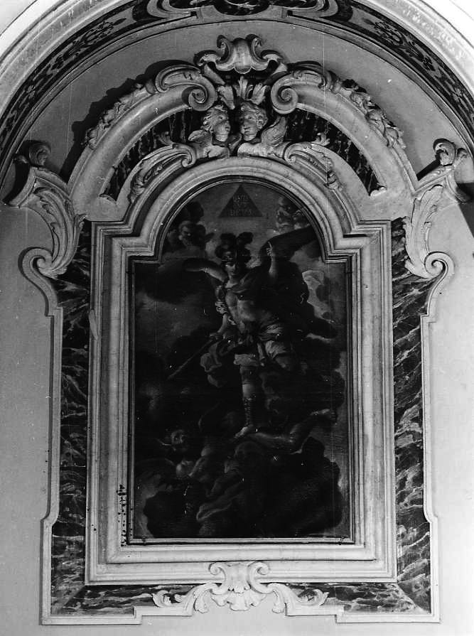 Cornice a impostazione architettonica di dipinto scanalata; nella parte superiore, tra le scanalature, due teste di cherubino a tutto tondo tra motivi floreali e volute a rilievo.