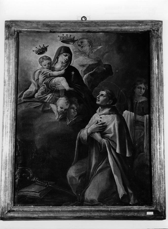 Il dipinto raffiura la Madonna del Carmine che appare a Sant'Andrea Corsini.. Personaggi: Madonna; Gesù Bambino; Sant'Andrea Corsini. Figure: figura femminile