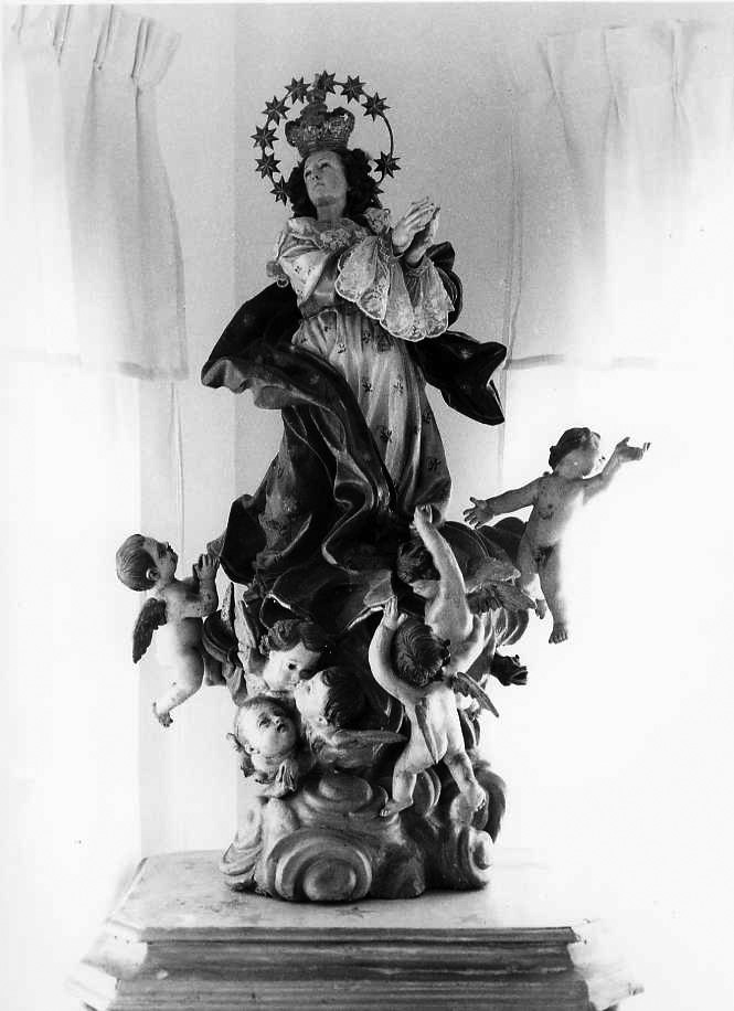 Gruppo scultoreo raffigurante l'Immacolata sulla falce lunare con il serpente. Corona d'argento lavorata a sbalzo sul capo. Angeli sulle nubi.. Personaggi: Madonna. Attributi: (Madonna) mezzaluna; serpente. Figure: angeli