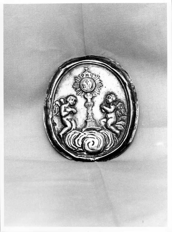 Medaglione ovale d'argento lavorato a sbalzo, raffigurante due angioletti in adorazione davanti all'ostensorio.. Simboli: calice eucaristico. Figure: cherubini