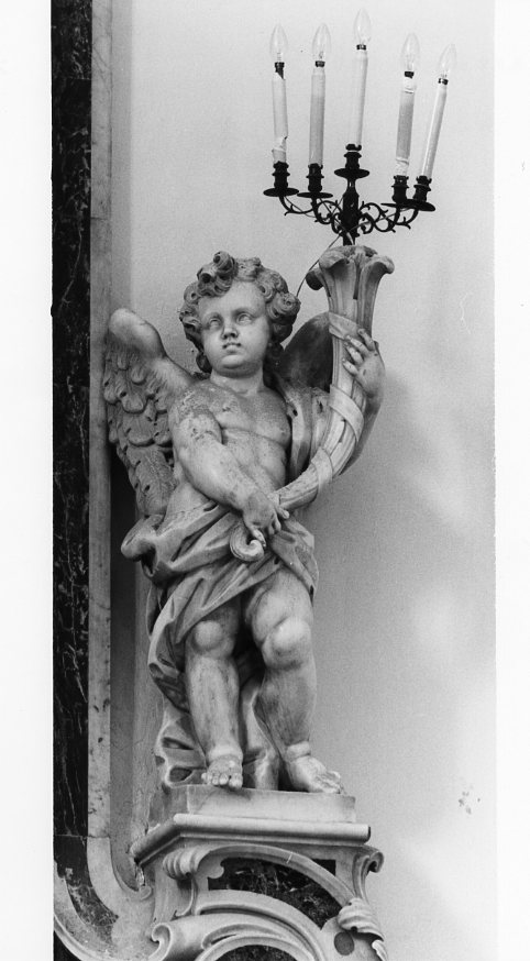 La statuetta rappresenta un putto a figura intera con il corpo nudo in parte avvolto da un panneggio. Esso regge una cornucopia in cui è infisso un candelabro a cique luci.. Figure: putto. Oggetti: cornucopia