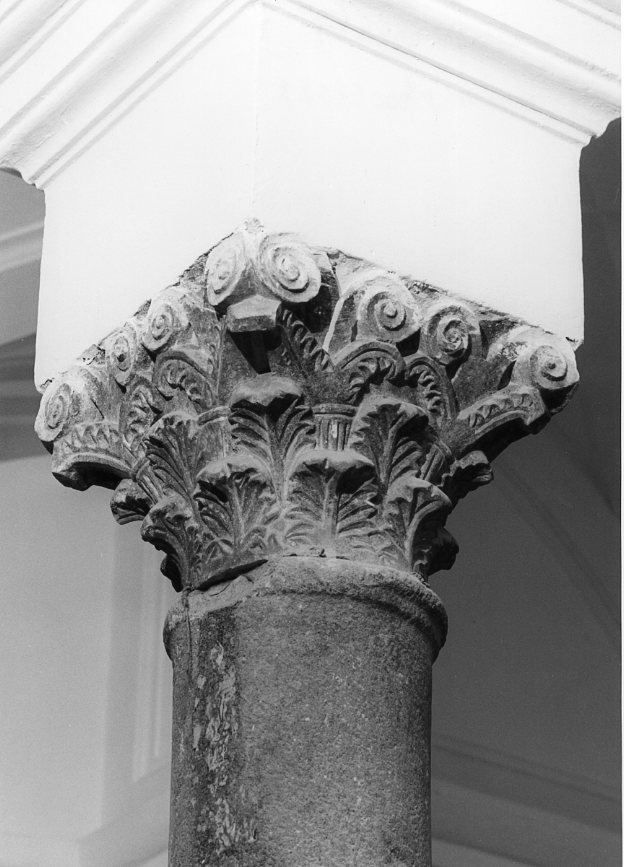 Il capitello presenta decorazioni vegetali e volute scolpite sui quattro spigoli con foglie d'acanto.