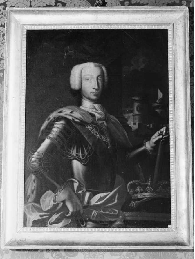 Il dipinto raffigura Carlo III vestito da guerriero,sullo sfondo si vede una torre e a destra poggiata sul tavolo ci sono la corona e lo scettro.. Personaggi: Carlo III. Attributi: ( Carlo III) scettro; corona
