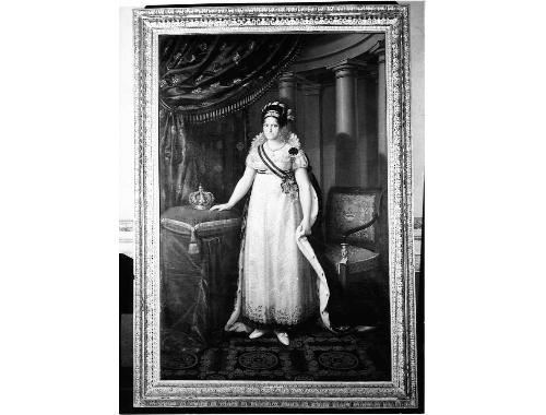 Ritratto a figura intera della Regina Maria Isabella in abito chiaro con manto di ermellino, diadema di perle e sul petto una fascia azzurra, bianca e rosa. Alla sua destra su un cuscino poggia la corona tempestata di gemme. In primo piano un drappo azzurro con fregi d'oro; a destra una poltroncina in legno intagliato e dipinto; in basso tappeto scuro; sul fondo colonne e pilastri.. Personaggi: Maria Isabella di Spagna. Oggetti: diadema di perle; fascia; manto; drappo; poltroncina. Elementi architettonici: colonne; pilastri. Simboli: corona